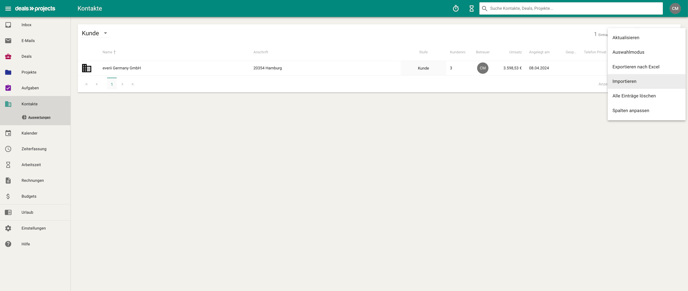 Über das Kontakte Importieren (Menü oben rechts, Adminrechte erforderlich) können die Angaben E-Rechnung sowie Leitweg-Id auch an bestehenden Unternehmen gesammelt aktualisiert werden, ohne jedes Unternehmen einzeln bearbeiten zu müssen.
